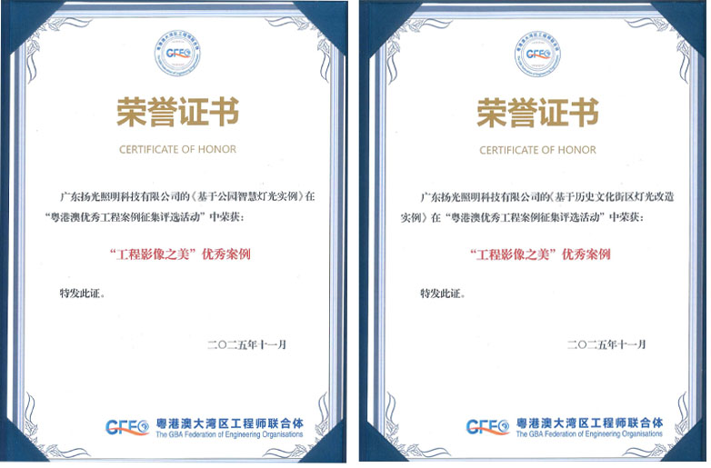 2025年11月30日,由中国工程师联合体指导,粤港澳大湾区工程师联合体、中国科技发展基金会、香港工程院等单位联合举办的第四界大湾区工程师论坛及大湾区优秀工程颁奖仪式在广州华南理工大学国际校区隆重举行。在此次评选中,扬光照明凭借“东莞记忆首开区历史文化街区灯光工程项目”及“东莞科学公园智慧灯光项目”双双荣获“工程影像之美”优秀案例称号,彰显企业在照明工程领域卓越的技术实力与美学追求。